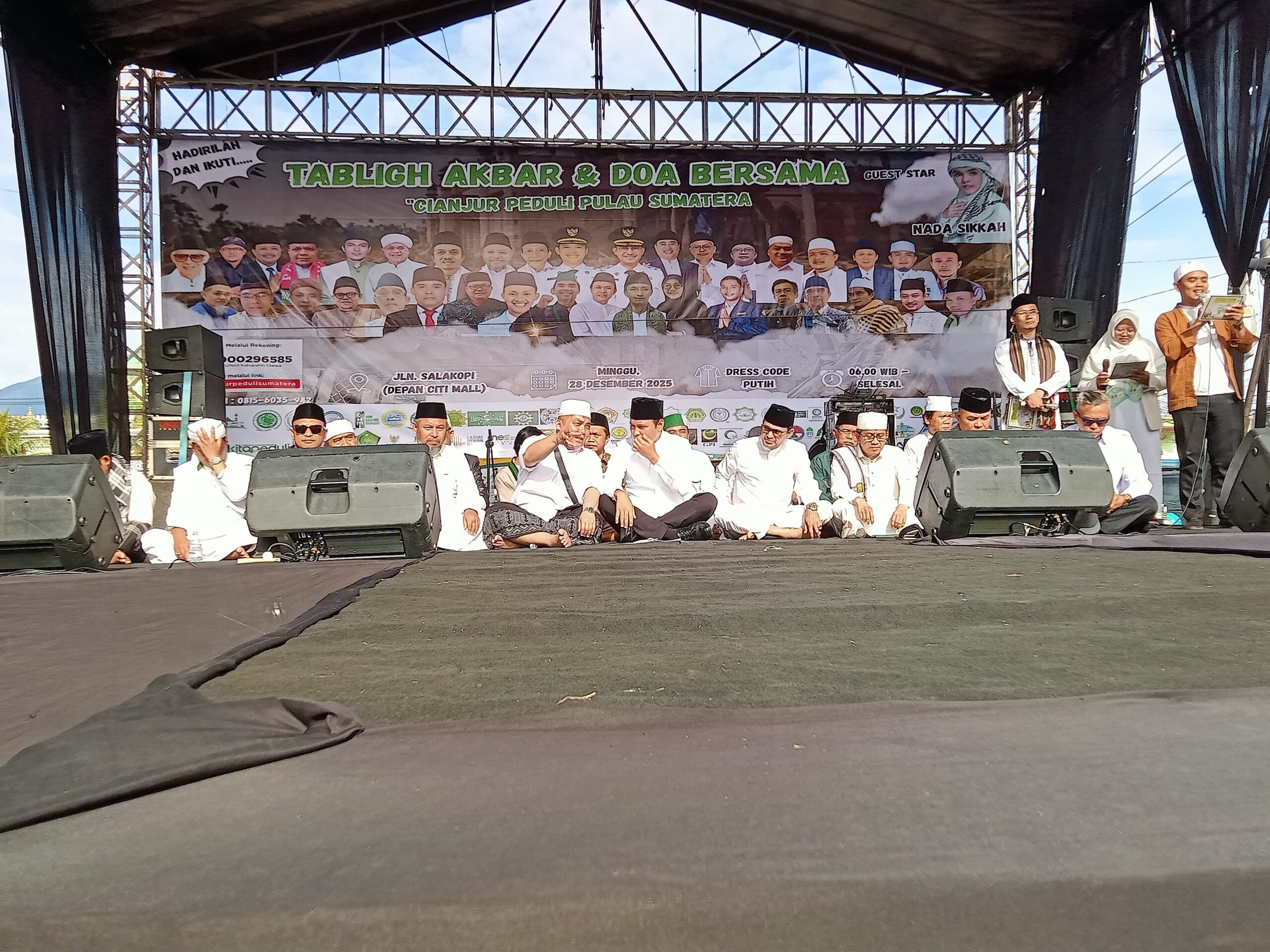 Cianjur, reaksinusantaranews.com — Badan Amil Zakat Nasional (BAZNAS) Kabupaten Cianjur bekerja sama dengan Majelis Ulama Indonesia (MUI) Cianjur menggelar Tabligh Akbar dan Doa Bersama bertajuk “Cianjur Peduli Pulau Sumatera”, Minggu (28/12/2025).