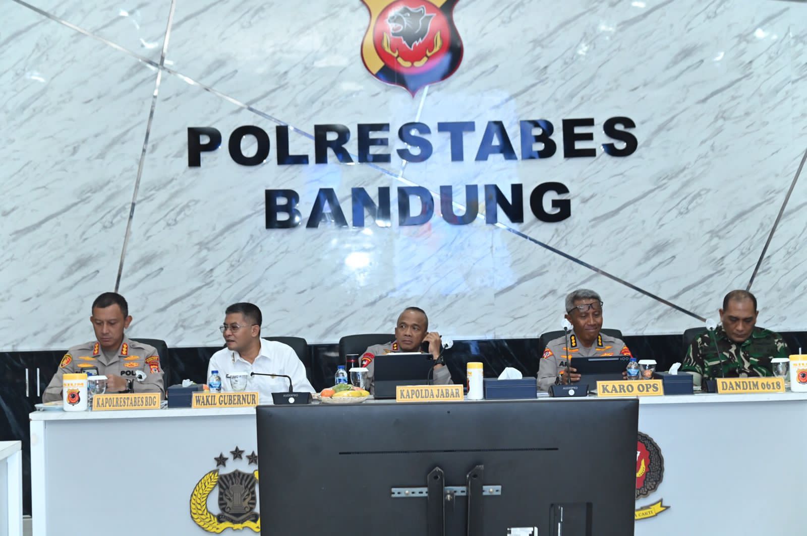 BANDUNG | Kapolda Jawa Barat Irjen Pol Rudi Setiawan memimpin rapat koordinasi pengamanan pertandingan Liga 1 Super League 2025/2026 antara Persib Bandung melawan Persija Jakarta, Kamis (8/1/2026), di Polrestabes Bandung. Rapat tersebut dihadiri Wakil Gubernur Jawa Barat, Karo Ops Polda Jabar, Kapolrestabes Bandung, Dandim 0618 Bandung, Pejabat Utama Polda Jabar, unsur panitia penyelenggara, TNI, Dishub, Satpol PP, serta para Kabag Ops Polres jajaran.
