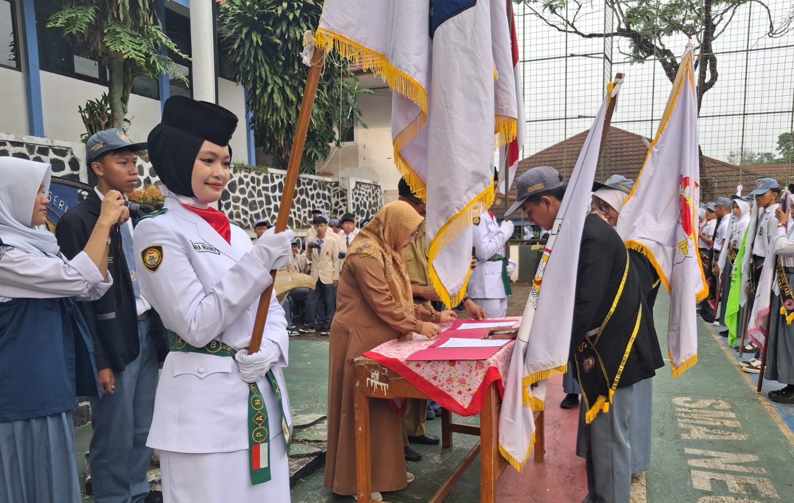 CIANJUR | reaksinusantaranews.com – SMA Negeri 1 Cilaku, Kecamatan Cilaku, Kabupaten Cianjur menggelar upacara serah terima jabatan pengurus OSIS dan pengurus Eskul yang baru di halaman SMAN setempat, Senin (13/10/2025).