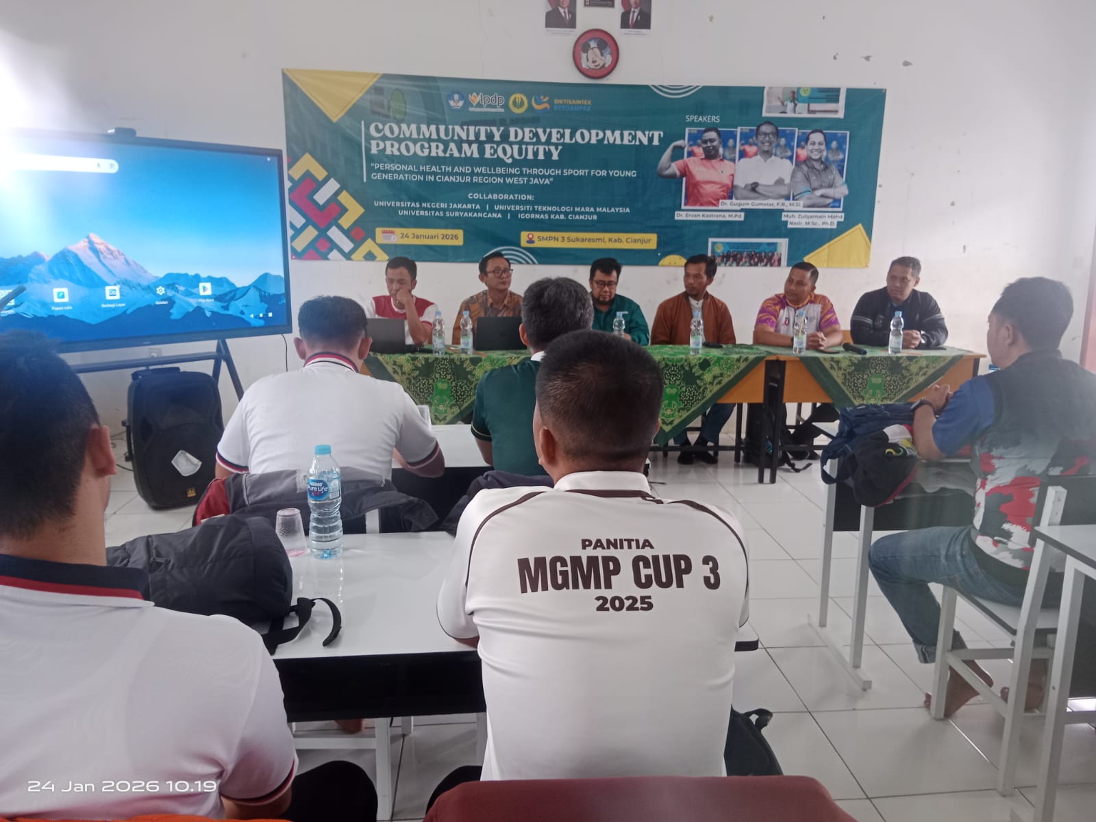 Cianjur, reaksinusantaranews.com – Universitas Negeri Jakarta (UNJ) menggelar Community Development Program EQuity bagi Guru Pendidikan Jasmani, Olahraga, dan Kesehatan (PJOK) se-Kabupaten Cianjur Wilayah 5 Subrayon Cianjur serta siswa tingkat SMP. Kegiatan ini dilaksanakan di Gedung SMP Negeri 3 Sukaresmi, Kampung Cipari, Desa Rawabelut, Kecamatan Sukaresmi, Kabupaten Cianjur, Sabtu (24/01/2026).