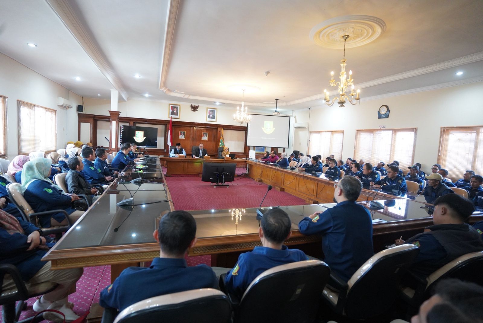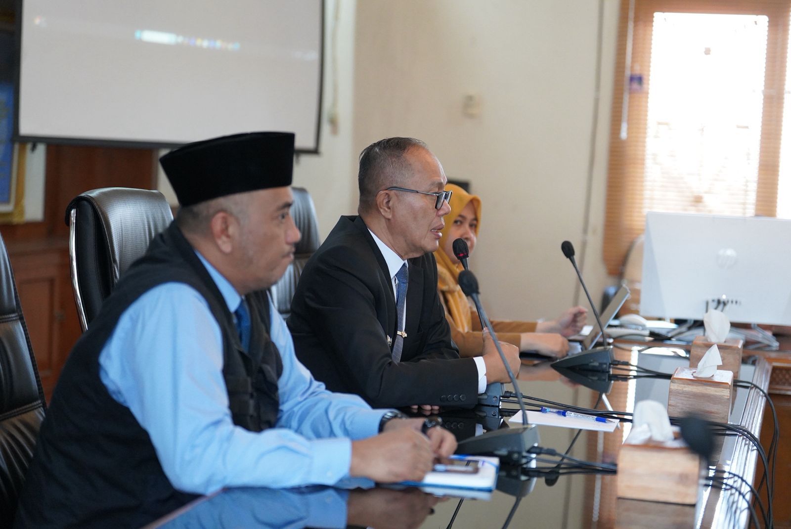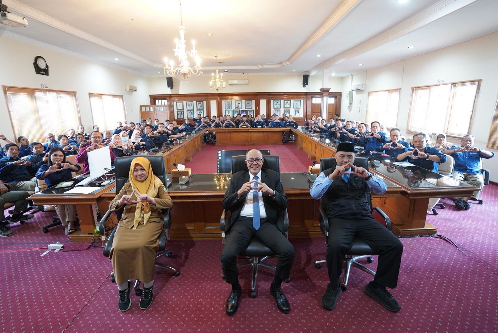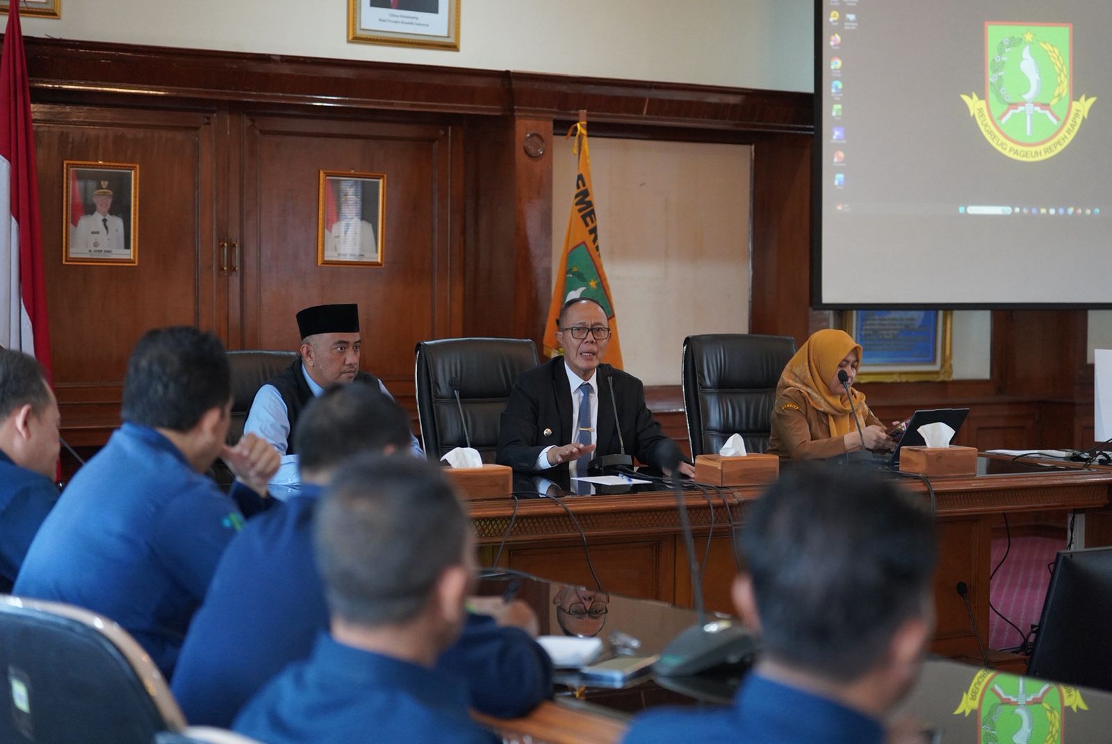 Wali Kota Sukabumi, H. Ayep Zaki (tengah), didampingi Asda III Setda Kota Sukabumi H. Imran Wardani (kanan) bersama jajaran pegawai Perumda saat mengikuti rapat pengarahan di Opproom Setda Kota Sukabumi, Selasa (10/3/2026).