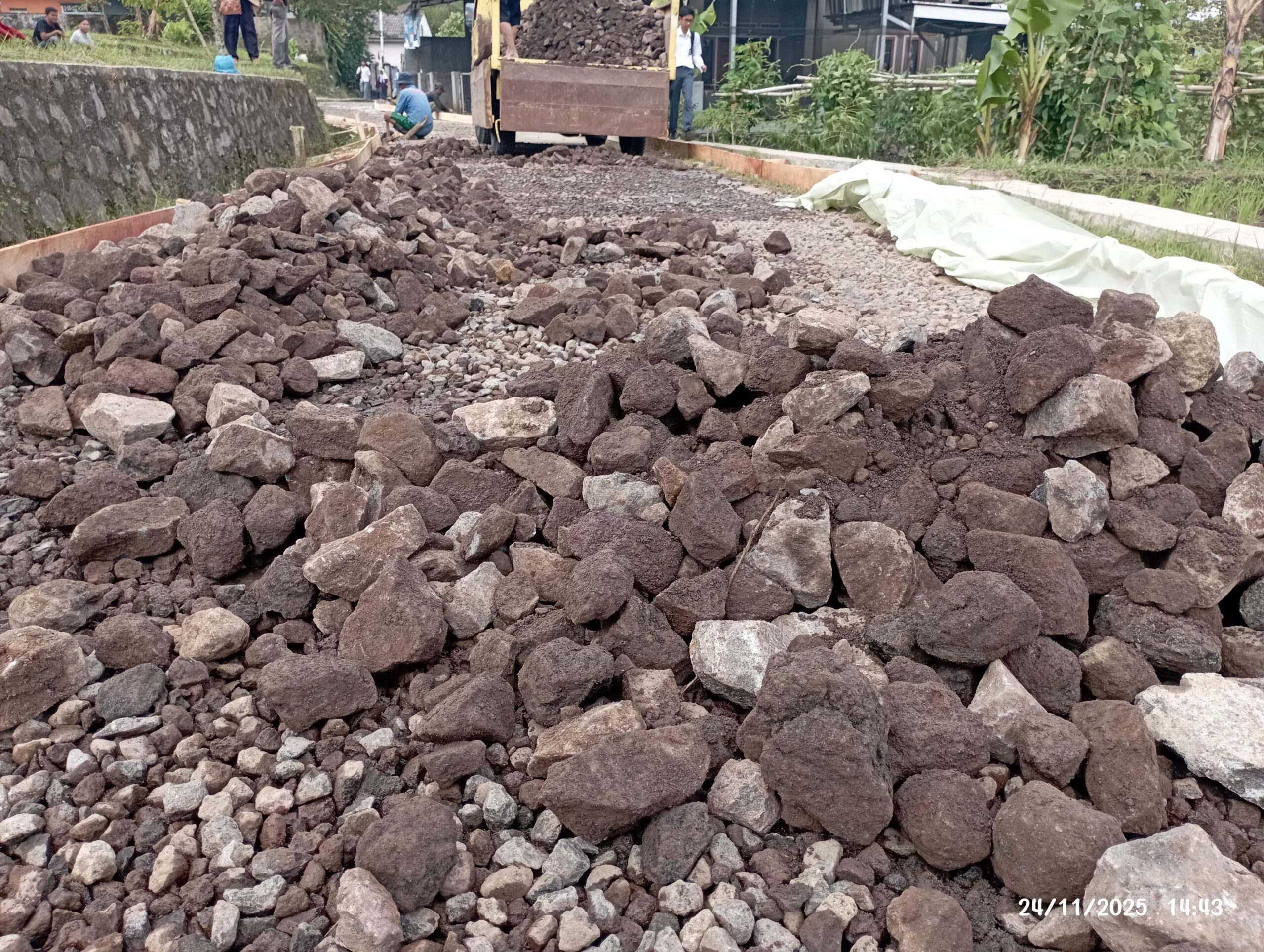 “Terlihat di lokasi, batu dan split yang diturunkan dari mobil diduga tidak semuanya split 23, tapi dicampur batu-batu besar. Padahal kondisi jalan masih keras, bahkan masih ada bekas hotmix. Sangat aneh kalau pengurugan memakai batu sebesar itu,” ungkapnya.